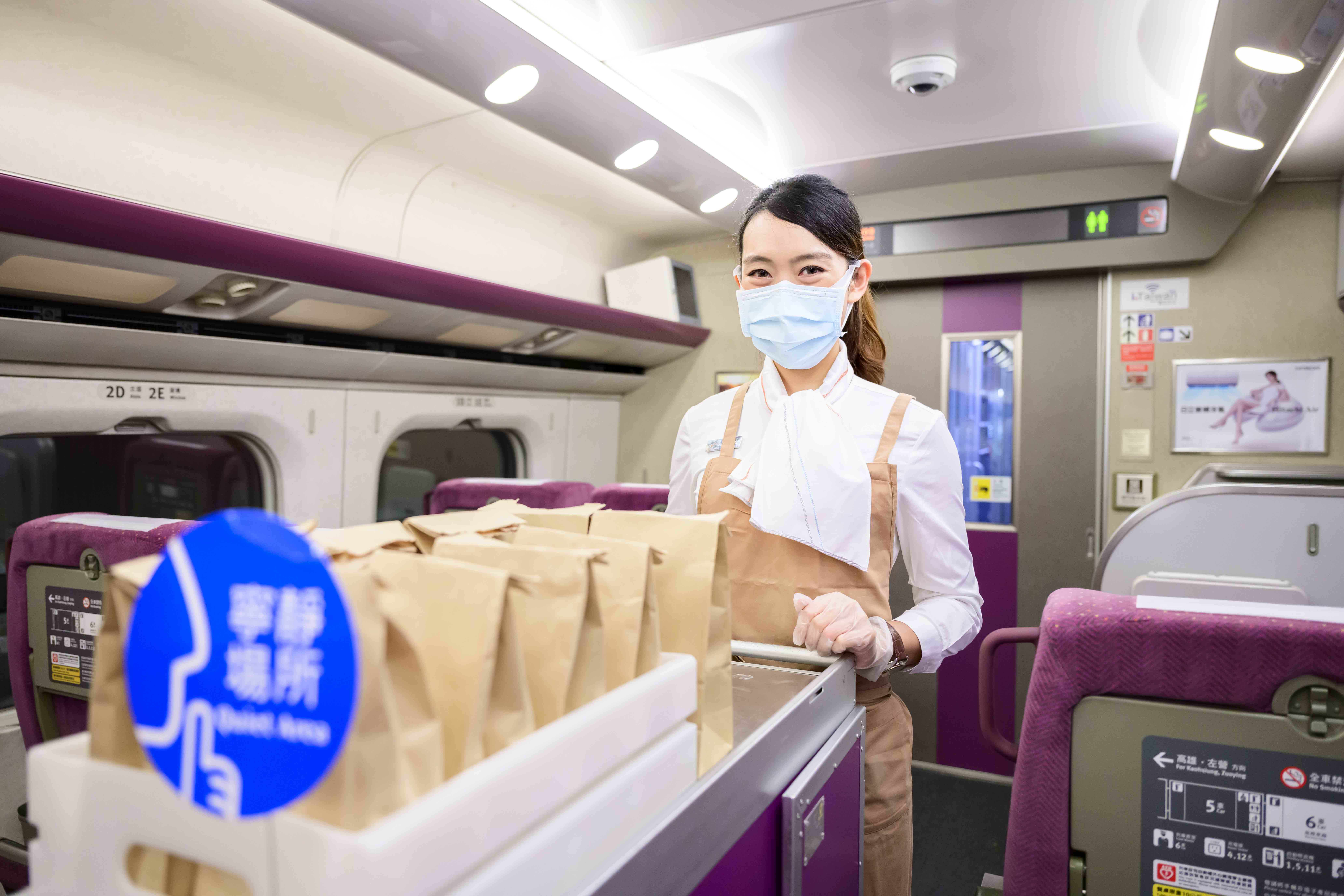高鐵公司特別提醒旅客,目前高鐵車廂內禁止飲食並同步暫停各項推車商品販售服務,旅客若因生理需求(如喝水、服藥、哺乳)需飲食者,請遵守保持社交距離規範,並應於飲/食用完畢後,儘速佩戴口罩;商務車廂亦暫停供應熱飲,改為提供單獨包裝之甜鹹點心各1份及瓶裝水,敬請旅客將餐點攜帶下車後再行食用。各車站內之付費區及非付費區,仍維持開放旅客在與不特定人保持社交距離或有適當阻隔設備之情形下,可暫時取下口罩飲食,飲食完畢須立即戴上口罩。