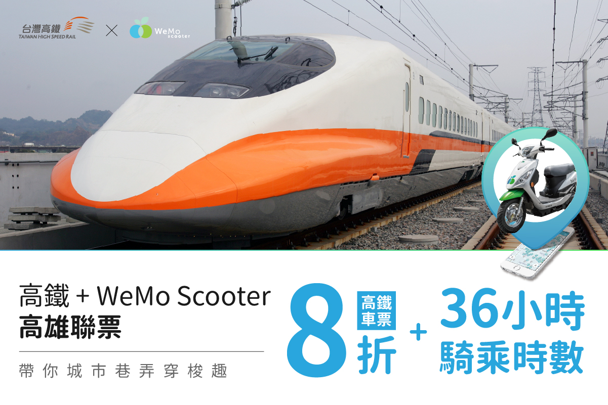 | 聯票內容 | 1. 高鐵標準車廂來回車票 8 折 (去程訖站/回程起站需為左營站) 2. WeMo Scooter 高雄套票優惠價 480 元(價值600元),高雄地區使用WeMo Scooter 36小時服務。 備註:敬請旅客於出發前一日完成 WeMo Scooter 會員註冊程序(含認證程序)。 |