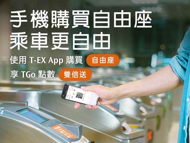 台灣高鐵公司表示,TGo會員參加「手機購買自由座,享TGo點數雙倍送」活動,每人每月最多回饋1次,活動期間最多可享有2次回饋(若當月多次搭乘,以加贈點數最高者計)。旅客在車站透過手機「T-EX行動購票」App購買自由座車票,不僅免去現場排隊時間,完成付款後直接持手機票證掃描QR code就能進站搭車,享受隨到、隨買、隨搭乘的便利服務,更可以透過手機票證減少紙票使用,為珍惜地球資源盡一份心力。