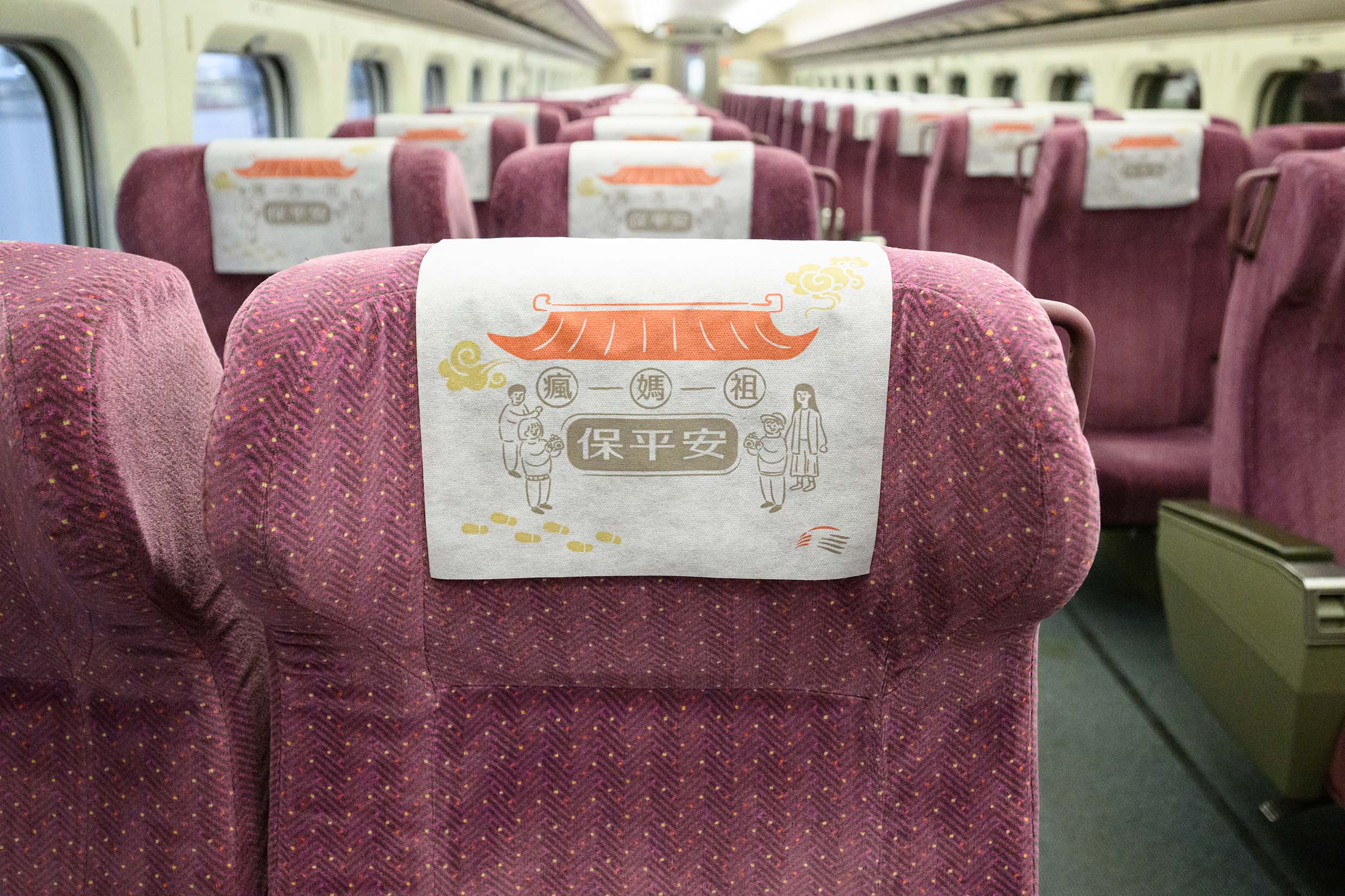 台灣高鐵公司首次結合媽祖信仰文化推出的「祈福頭靠墊」,是以宮廟慶典、信眾行腳為設計靈感,透過廟宇飛簷的莊嚴線條呈現進香的熱鬧情境,襯托眾人祈願媽祖護佑的虔誠心情。希望透過高鐵列車,傳遞「瘋媽祖 保平安」的信仰力量,讓每一位旅客感受台灣在地善良、淳厚的人文魅力!