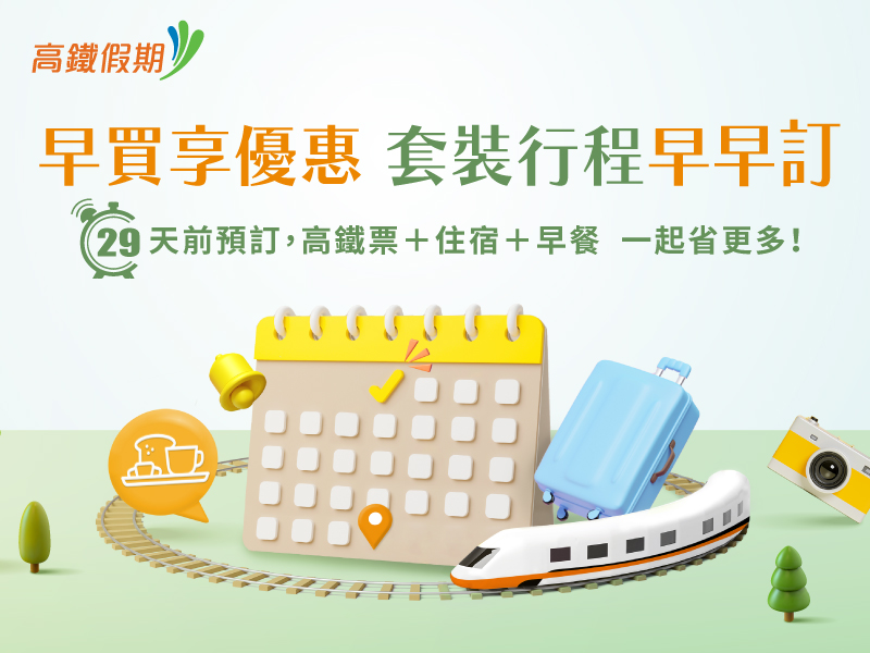 此外,高鐵假期自由行也特別推出「29天前預購優惠」專案,精選全台25間飯店搭配高鐵來回車票,29天前訂購就可享超值優惠,以台北出發兩人同行為例,入住台中頭等艙飯店綠園道館每人只要2,000元起;入住台南榮美金鬱金香酒店,每人也只要3,380元起,相當於高鐵來回車票加少少的錢就可享車票+住宿一晚的雙重優惠,歡迎旅客提早預定享好康。