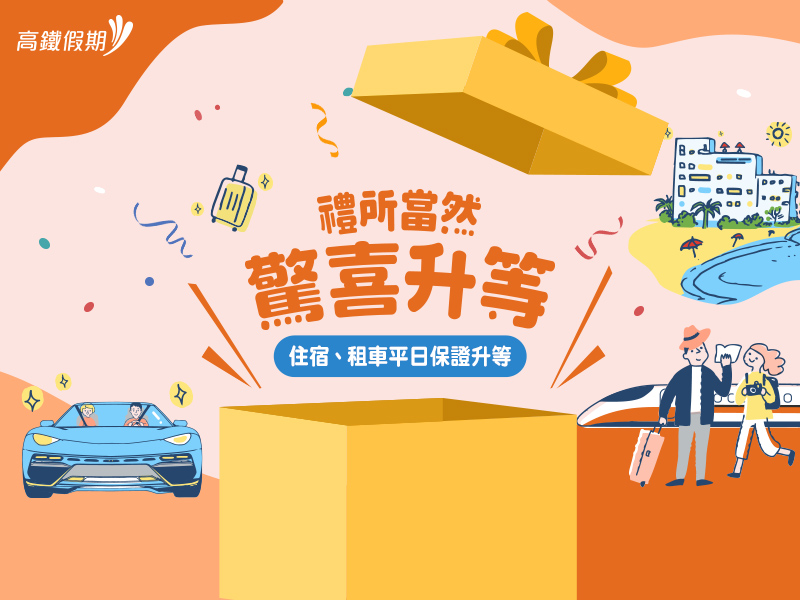 「禮所當然 驚喜升等」高鐵假期自由行專案,產品內容均包括:高鐵標準車廂對號座來回車票及一晚精選飯店住宿,不僅可享平日入住保證房型升等,另藏驚喜彩蛋,有機會獲得飯店加碼,幸運入住套房!以台北凱撒大飯店為例,不僅平日入住保證升等「雅緻客房以上房型」,更有機會升等至「站前套房」一覽台北夜空。兩人同行左營出發每人只要3,020元起,相當來回票價再加40元即可成行;另以入住高雄寒軒國際大飯店為例,平日入住保證升等「全景客房」,更有機會最高升等至「寒軒套房」,兩人同行台北出發 每人也只要3,120元起!