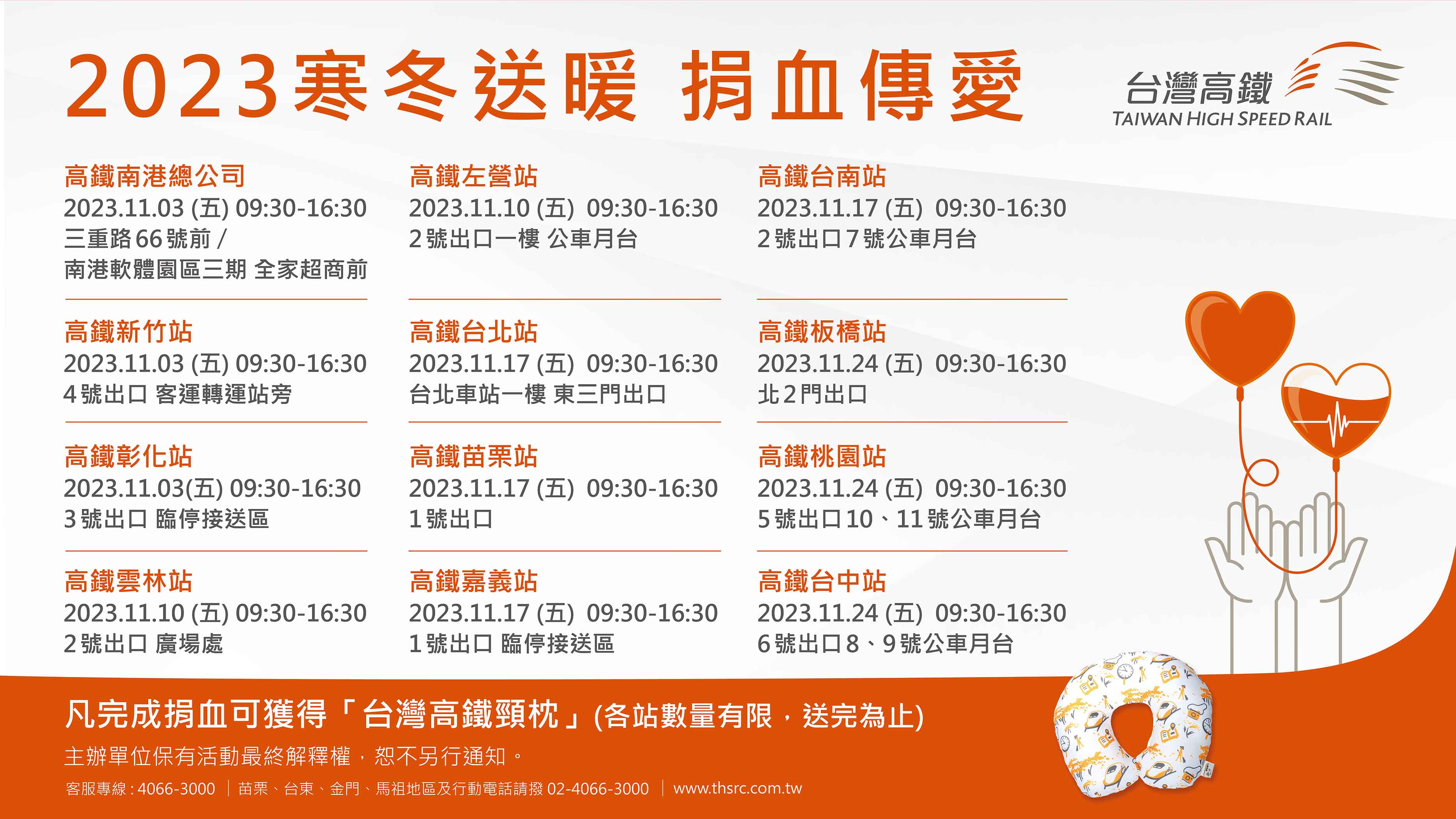 台灣高鐵公司自2012年開始舉辦「寒冬送暖 捐血傳愛」公益活動,即將邁入第12個年頭,累計吸引超過17,000位捐血人參與,共募得22,743袋熱血。為了將這份愛延續下去,台灣高鐵公司將自11月3日起至11月24日止,每逢週五分別於高鐵南港總公司及沿線11個車站(各站舉辦日期、地點,詳附表),再度溫馨啟動捐血活動。