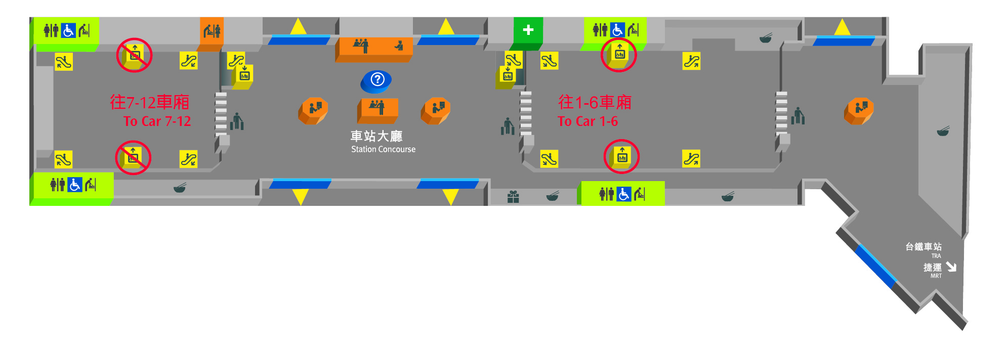114年10月28日至115年2月28日,北區往月台層電梯暫時封閉,如需使用電梯,請改由1-6車廂驗票閘門進站,造成不便敬請見諒。(工程已提前於2026/2/14完成)