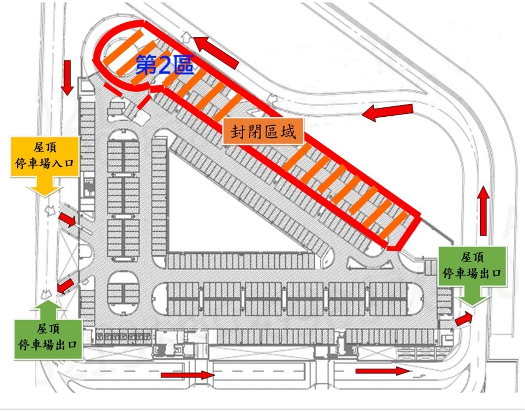 施工期間將封閉停車場3F(頂樓)部份停車空間及東側入口(靠74道路入口)。