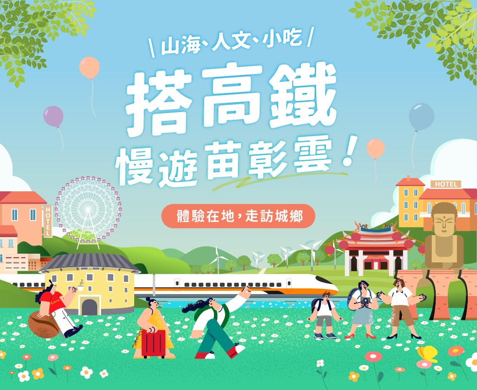 台灣高鐵公司結合在地觀光資源與產業能量,規劃「搭高鐵.慢遊苗彰雲」旅遊產品,高鐵車票加住宿或在地遊程優惠,帶您搭高鐵輕鬆走訪苗栗、彰化與雲林三大特色城鎮,每一站都值得慢慢停留,欣賞豐富自然景觀、體會歷史文化與純樸人情,無論親子出遊或好友小旅行都非常適合。歡迎您現在就預訂一趟說走就走的春季小旅行,搭上高鐵離開城市的快節奏,放慢步調深度探索山城、小鎮及農村的人情與風景。