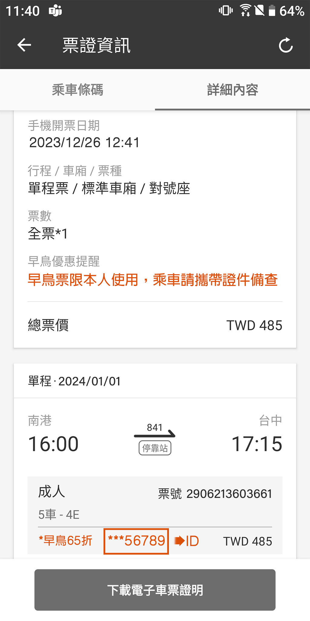 • 旅客持早鳥優惠車票乘車時,應攜帶與票面登錄證號相符之「身分證明文件正本」以供查驗,無法出示身分證明文件正本、證號不符或無法識別本人乘車時,將依「無票乘車」規定補票,並得加收已乘區間票價 50% 違約金;原票亦不得申請退票。前述「身分證明文件正本」係指政府核發附有照片、身分證字號等足茲證明身分之證件。