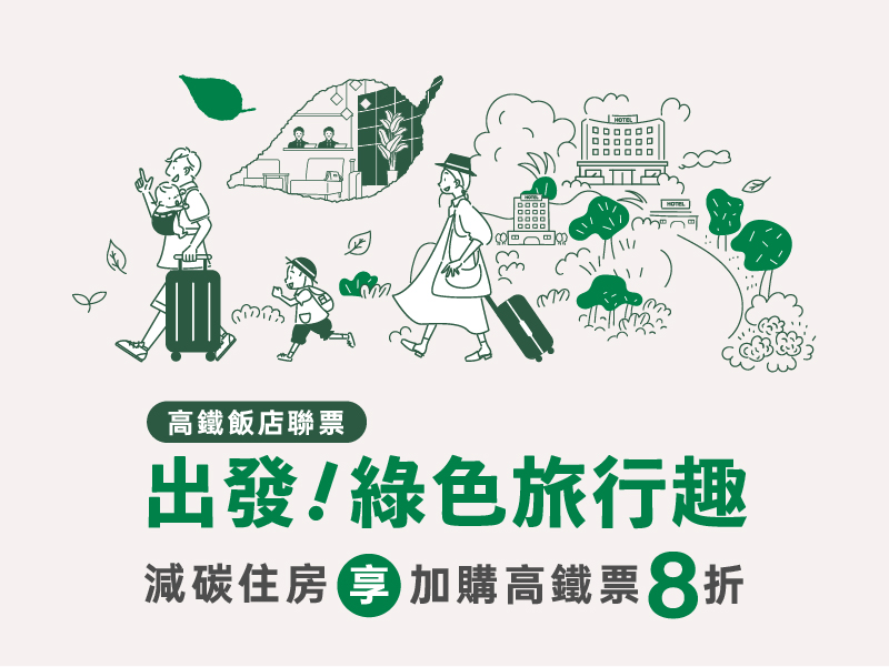 因應綠色旅遊風潮,台灣高鐵「飯店聯票」也融入環保元素,集合全台逾120家優質飯店,即日起至6月30日推出「出發!綠色旅行趣」專案,鼓勵搭乘高鐵減碳旅行,飯店官網訂房可享加購高鐵票8折優惠,專案享房價優惠,指定飯店再加贈環保餐具、環保提袋、環保杯及公共運輸乘車票券等好禮,以實際行動鼓勵旅客實踐低碳永續旅遊。以入住台北凱撒大飯店為例,精緻客房每晚3,300元起,若加購高鐵車票,每房再贈台北捷運一日票兩張,歡迎旅客一起響應環保,享受美好假期的同時,不忘減碳愛地球。