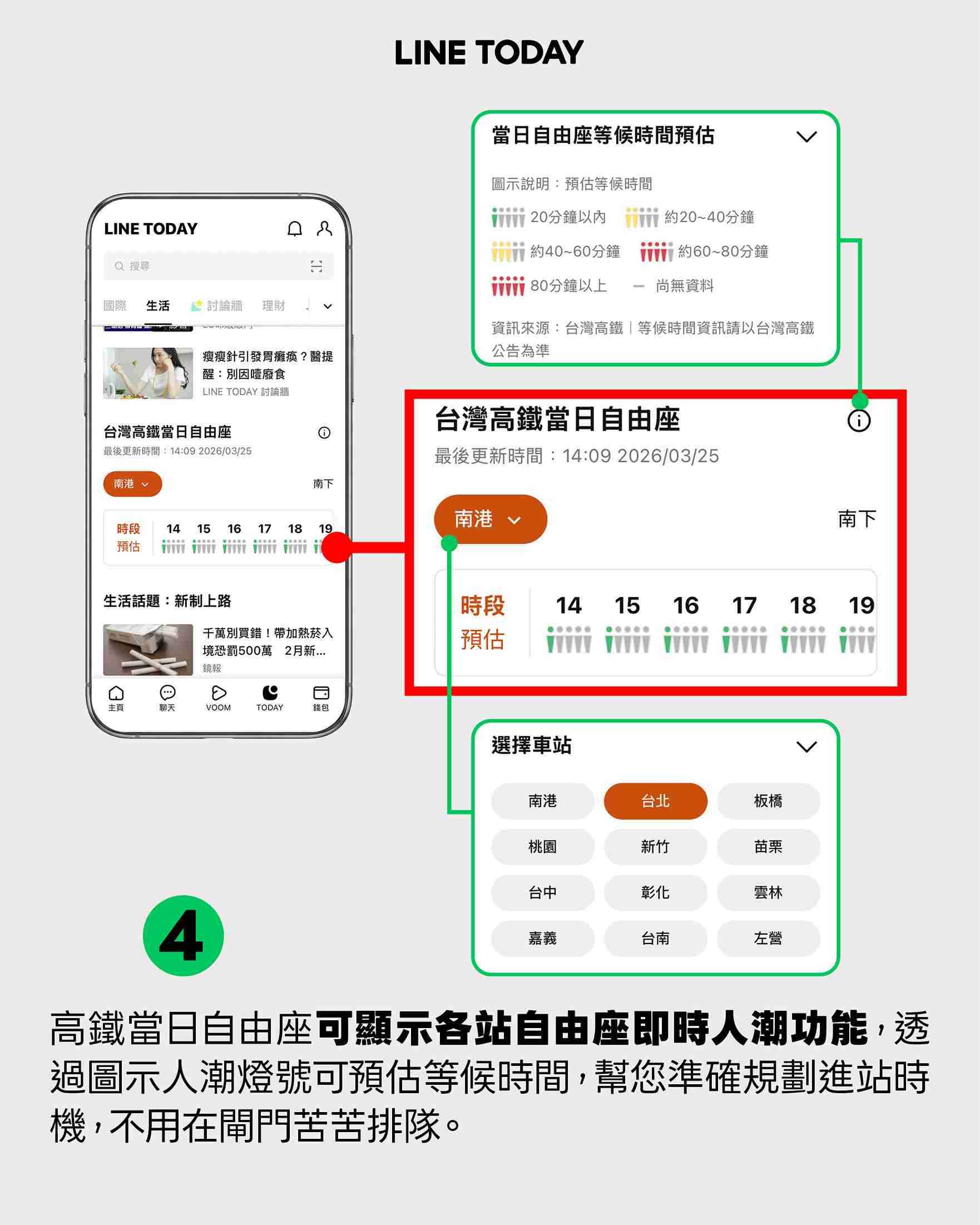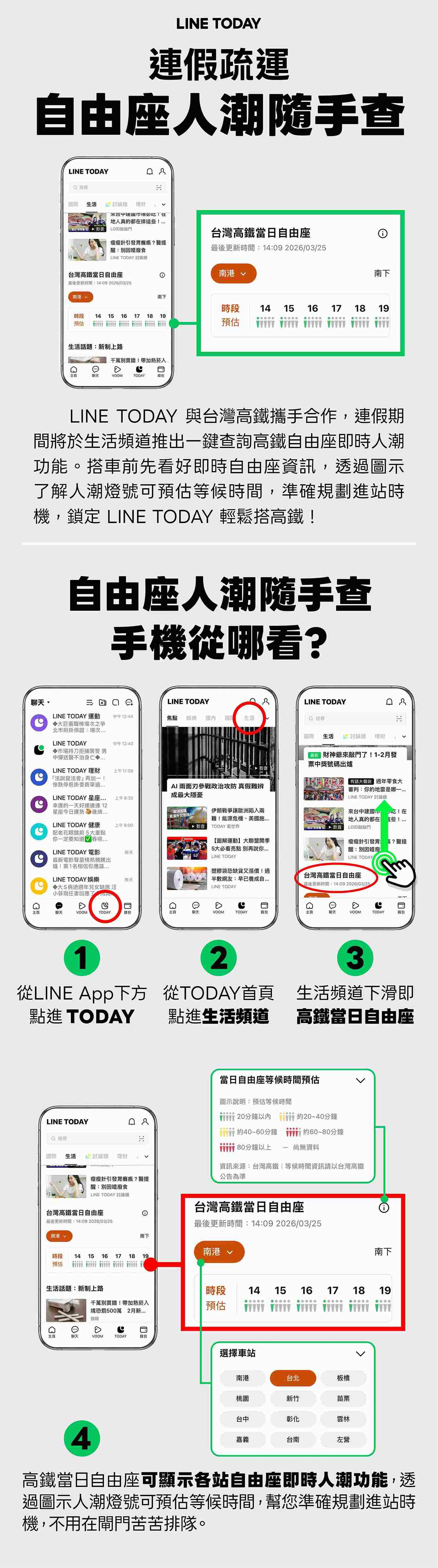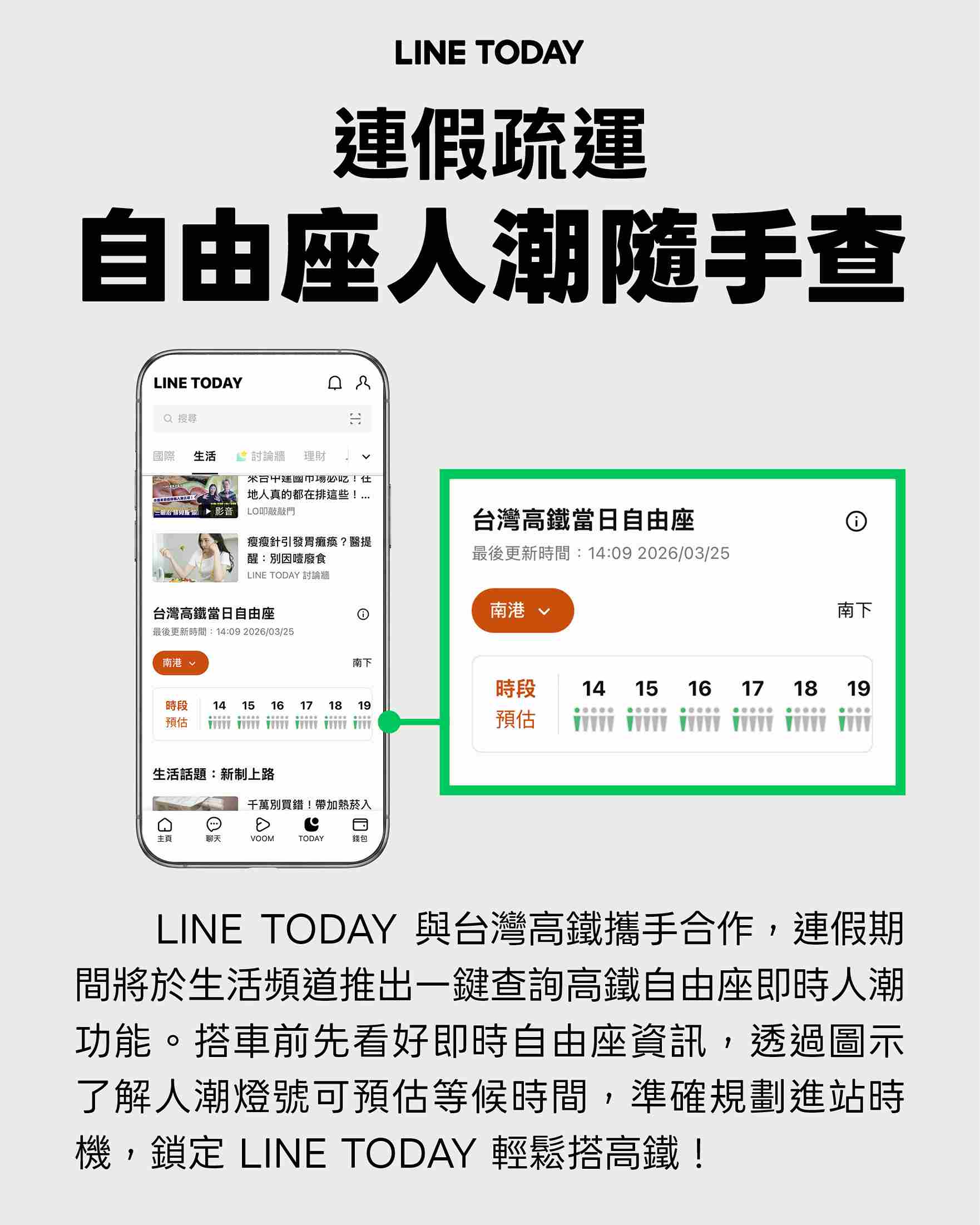 清明假期疏運(4/2-4/7)即將展開!總計6天加開191班次,提供1,162列車的旅運服務。台灣高鐵公司提醒旅客,預計4/2傍晚起將有第一波返鄉人潮,敬請旅客提早到站,預留更充裕的候車時間,避免因人潮過多而延誤行程。高鐵公司已於各車站加派人力,全力引導旅客,敬請優先禮讓對號座旅客上下車,而針對自由座旅客,台灣高鐵也提供了更加便利、即時的公共服務,再度與LINE TODAY「生活頻道」合作,於疏運期間推出「當日自由座等候時間預估」服務,功能再優化一鍵下滑即可即時查詢,且頁面新增車站下拉式選單,以便快速查詢,方便自由座旅客預先掌握當日各站預估排隊等候時間,敬請優先選擇綠色燈號時段搭車,享受更加順暢、舒適的高鐵旅程。