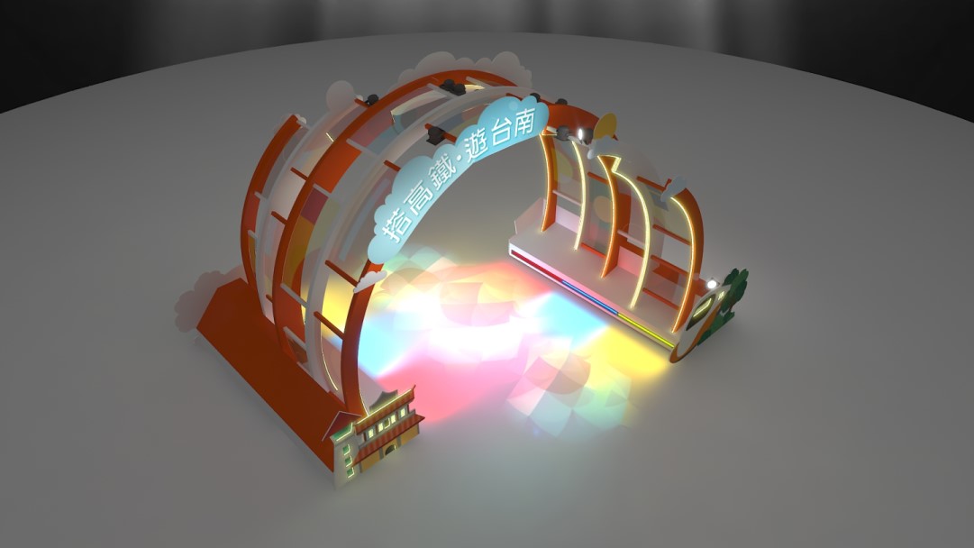 為了歡迎自各地前來台南欣賞「台灣燈會」的旅客,台灣高鐵公司特別以「搭高鐵・遊台南」為主題,在台南站2號出口處,精心打造一座高達3.5公尺光影藝術裝置。白天運用太陽光折射,讓色彩豐富的壓克力板在地面自然呈現繽紛圖案,晚間則改以LED燈投射,營造出更加幻變的光影效果,讓旅客無論白天或晚上來到高鐵台南站,都能立刻感受「台灣燈會」的繽紛活力。
