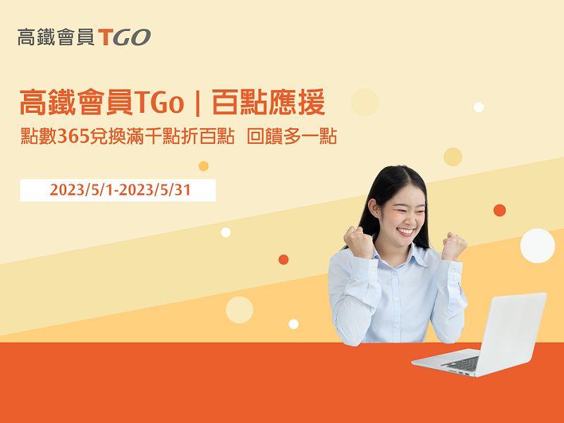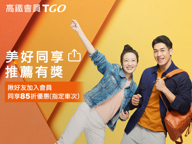 您加入高鐵TGo會員了嗎?台灣高鐵公司即日起至6/30止,推出會員專屬「美好同享 推薦有獎」活動,邀請TGo會員揪好友一同加入,只要簡單3步驟,您跟好友就可同享高鐵指定車次85折購票優惠,不只推薦越多、優惠越多,還有更多優惠活動:點數365平台「5月限定 百點應援」、「月月GO有禮 指定車次88折」以及「美好禮乘 指定會員專屬」,會員專屬優惠享不完!歡迎會員現在立刻揪起來,讓更多親朋好友一起成為TGo會員,共創美好多一點的高鐵旅程。(詳活動網頁)