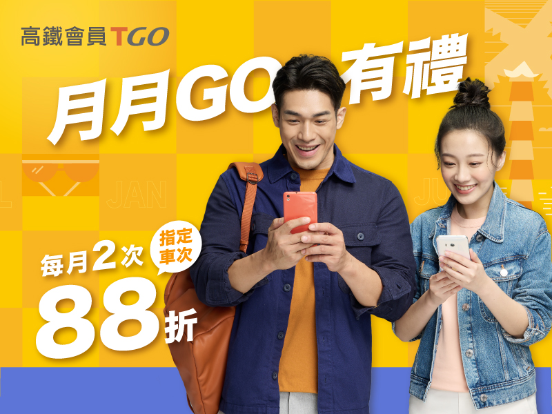 | 月月GO有禮 指定車次88折 | 全會員享每月2次指定車次標準車廂對號座88折優惠。 |