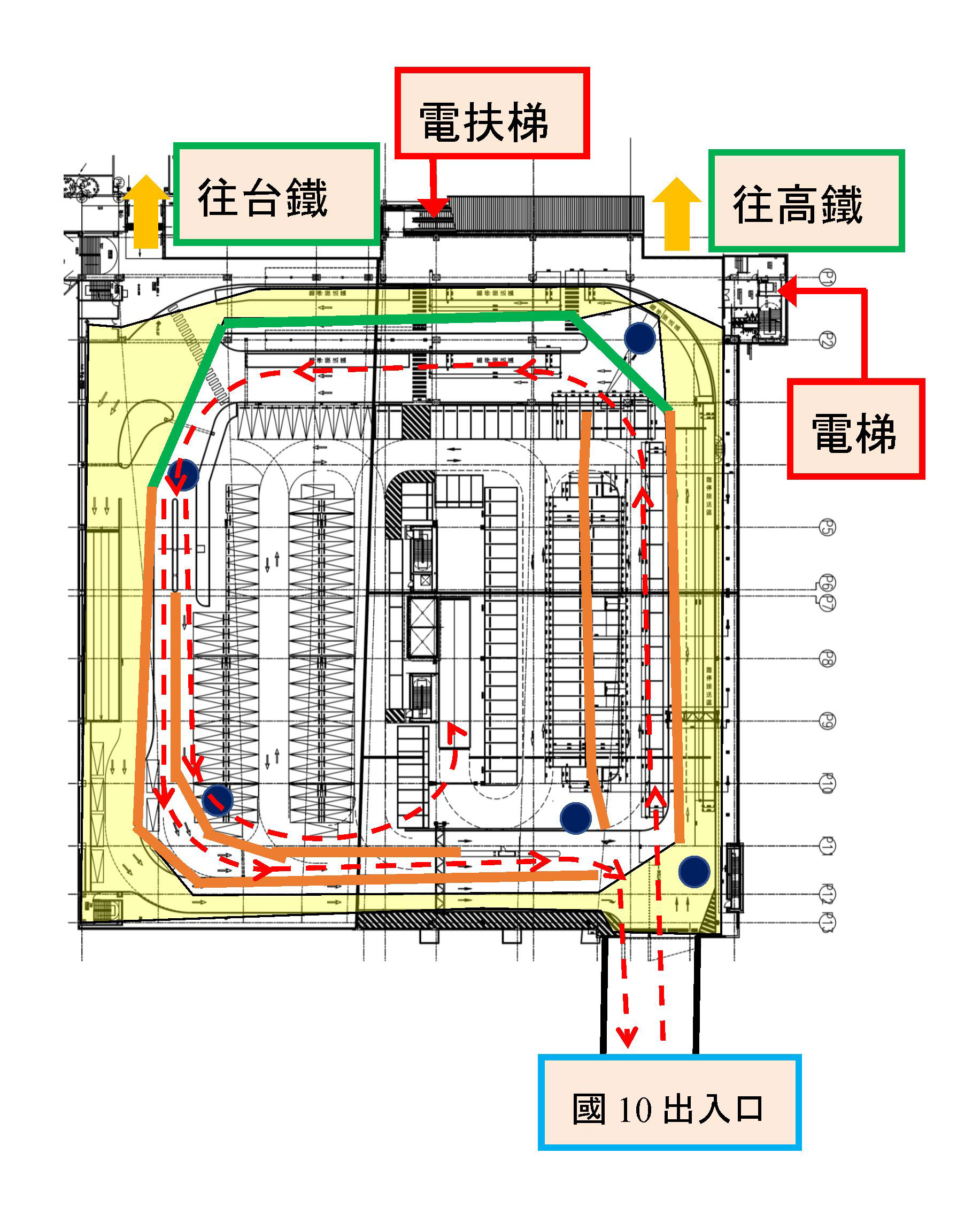 本次施工期間,將影響停車場4樓部份車道,臨停接送區車位減少,如有接送旅客車輛臨停需求,請多利用停車場內各樓層30分鐘免費停車,或改於1樓高鐵路(臨停接送區)接送旅客。