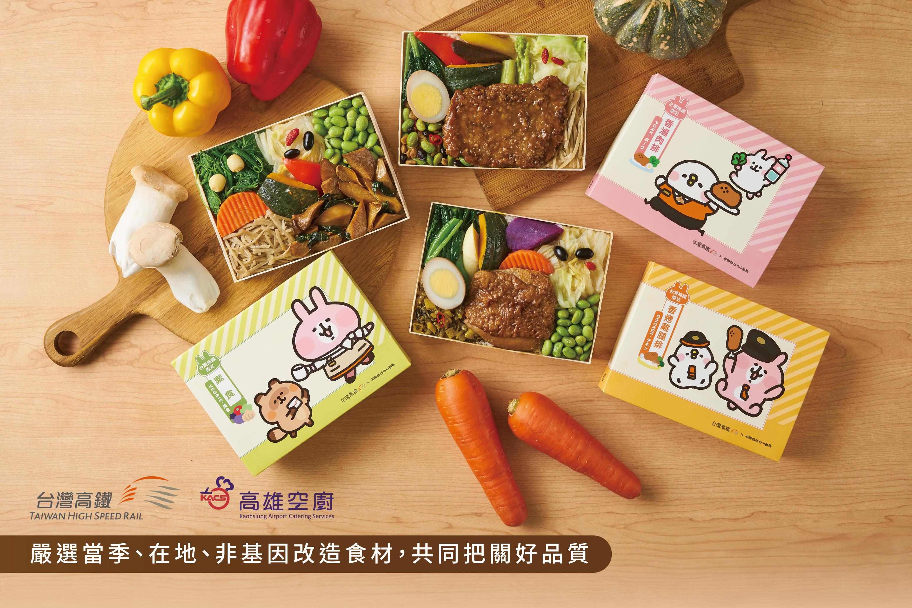 「高鐵便當」延續旅客最喜愛的「香滷肉排」、「香烤雞腿排」及「三杯杏鮑菇(素食)」三種口味,這次更特別配合「鐵路便當節」舉辦,推出全新配菜,採用夏令盛產時蔬,將雲林紫心地瓜、南投茭白筍、台南蘆筍、蓮子等美味入菜,嚴選台灣CAS認證農產品、產銷履歷蛋品、非基因改造豆製品及台灣CNS一等米,食材多以清炒蒸煮等料理方式烹調,保留食物原味營養滿足味蕾,更注重營養均衡,還能夠支持台灣本土農業。色香味俱全的「高鐵便當」均由高雄空廚製作,並通過ISO 22000及HACCP食品安全認證,讓美味兼顧食安。