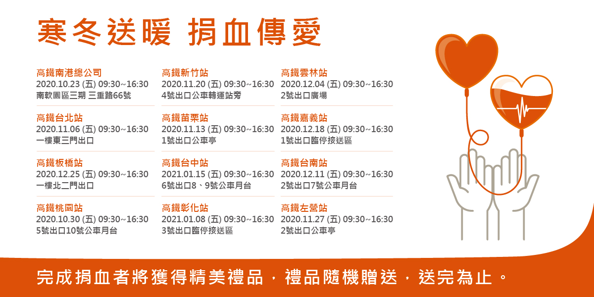 高鐵公司表示,「寒冬送暖 捐血傳愛」活動自2012年舉辦以來已邁入第9年,累計超過1萬名捐血人熱情參與,共募集10,068袋熱血。高鐵公司呼籲大家把愛心化為實際行動,讓血庫存量能夠供給無虞。同時,為表達對捐血人感謝,凡參加「寒冬送暖 捐血傳愛」活動的員工或民眾,完成捐血後皆可獲得精美禮物乙份,數量有限,送完為止。(各站舉辦日期,詳附表)