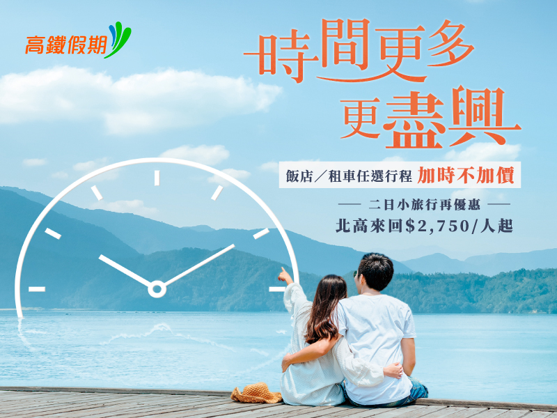 台灣高鐵公司規劃多樣化旅遊商品,積極帶動國旅風潮!特別推出高鐵假期「加時不加價」限時優惠,11月底前提供旅客完整24小時住宿的高鐵+住宿,以及租車24小時再加送6小時的高鐵+租車兩種選擇,時間更多、玩得更盡興;此外,新推出高鐵假期「2日精緻遊」產品,第一天專人帶您體驗豐富行程,第二天留空間讓您自由運用。歡迎趁著秋高氣爽、最適合出遊的季節,把握高鐵假期限時超值優惠,輕鬆、自在「搭高鐵・遊台灣」。