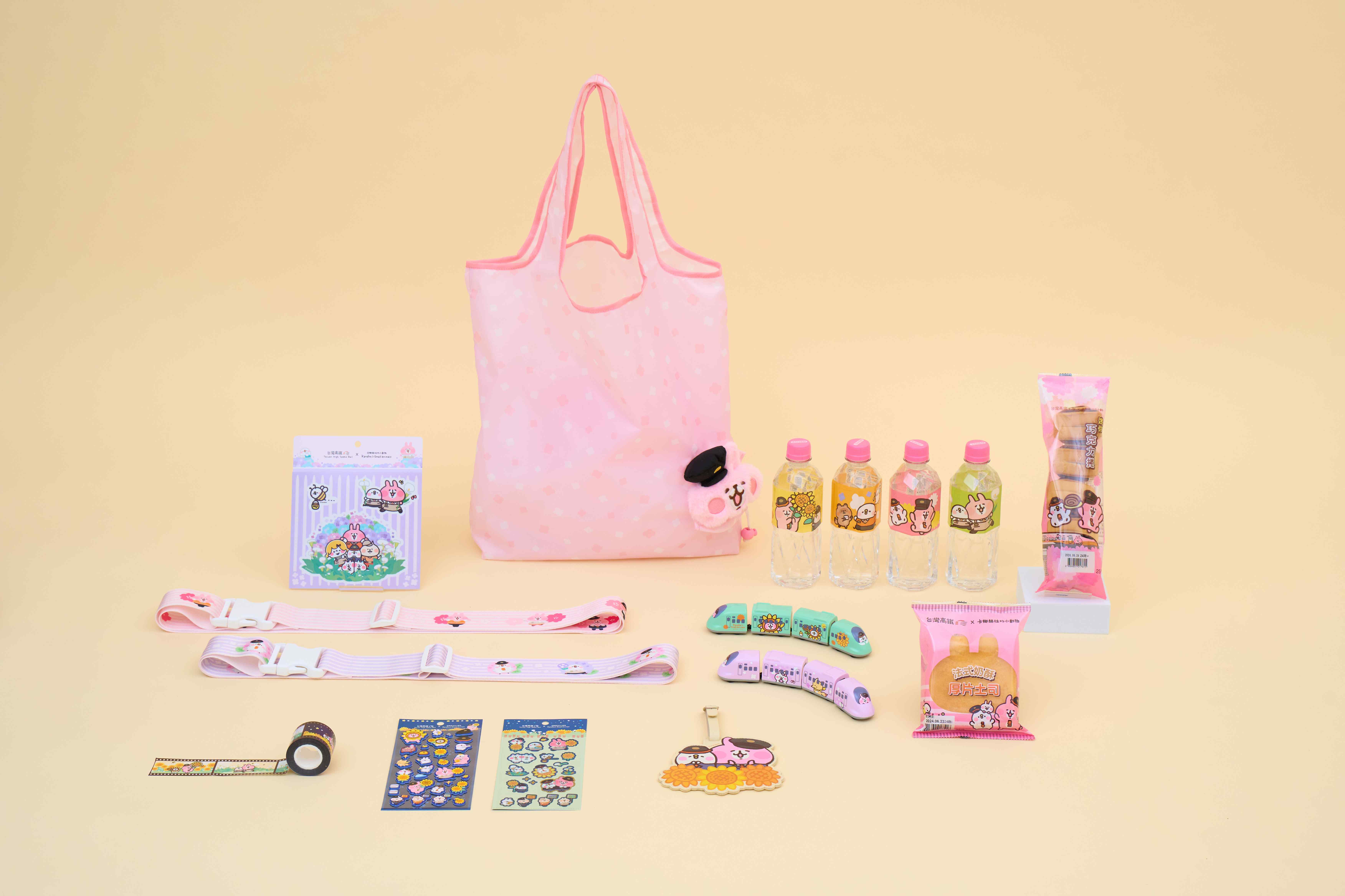 台灣高鐵公司表示,此次推出的聯名新品,有出遊必備可愛小物,包括行李束帶、行李貼紙、行李吊牌,讓您隨興妝點行李箱,展現個人獨特的旅遊風格;另有萌度破表的泡泡貼、金粉貼紙以及獨家隱藏版聯名PET底片造型膠帶等,讓您隨時隨地都有好心情。新款聯名商品除在「T-Shopping高鐵線上購」獨家販售外,高鐵站內便利商店及自動販賣機亦可購買(四輛組玩具車及絨毛收納袋為T-Shopping高鐵線上購8月份獨家商品),輕鬆入手喜愛商品。