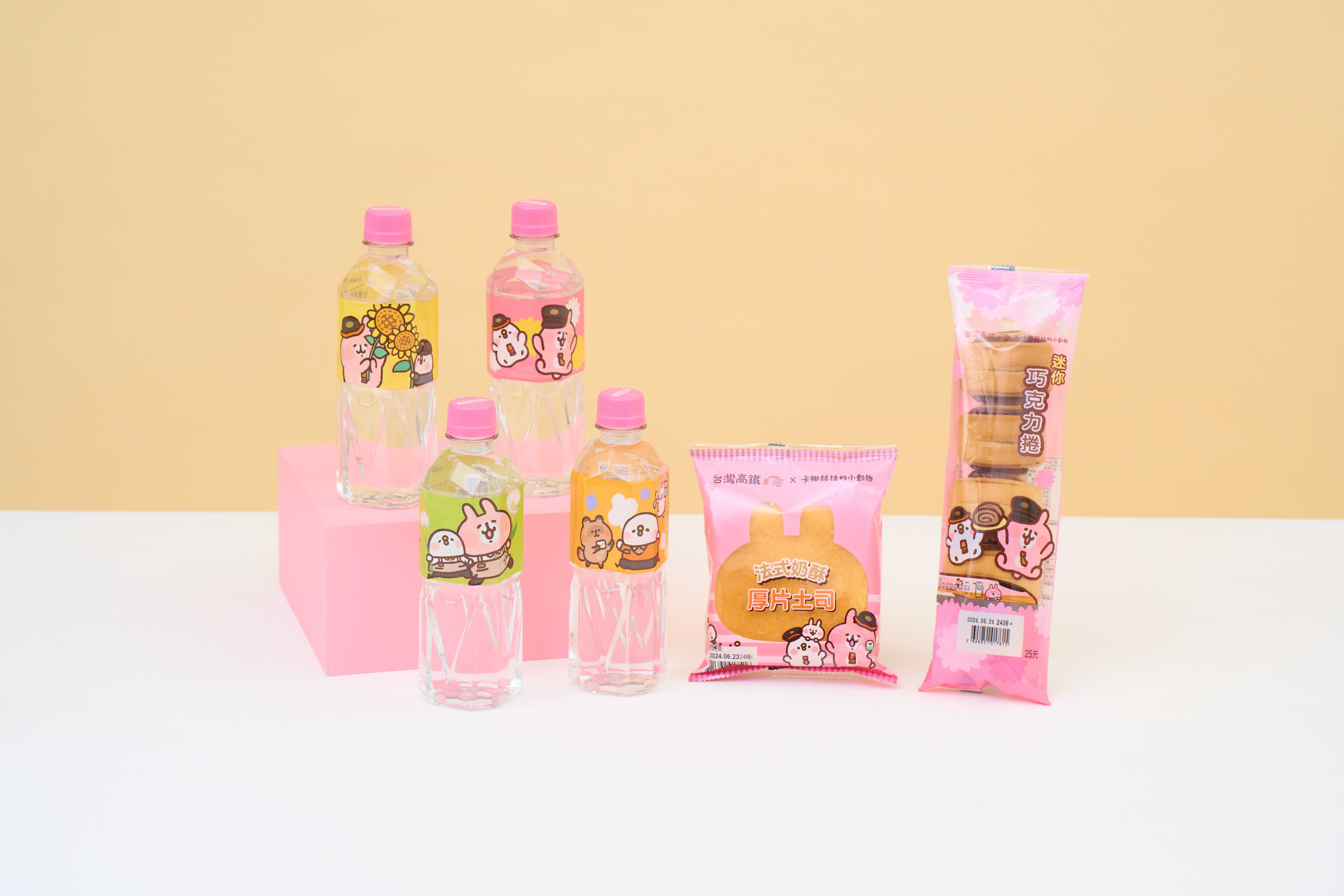 此外,台灣高鐵公司與台塩海洋鹼性離子水合作的聯名瓶裝水,這次也推出4款全新包裝,即日起透過高鐵站內7-ELEVEN門市及「T-Shopping高鐵線上購」販售;此外還有3款聯名系列糕點,包括在全台7-ELEVEN門市都可買到的迷你小饅頭及法式奶酥厚片土司,以及在「T-Shopping高鐵線上購」限量販售的起士公爵聯名原味乳酪蛋糕;蛋糕上特別烙印可愛的P助與粉紅兔兔手持向日葵圖案,送禮自用兩相宜。